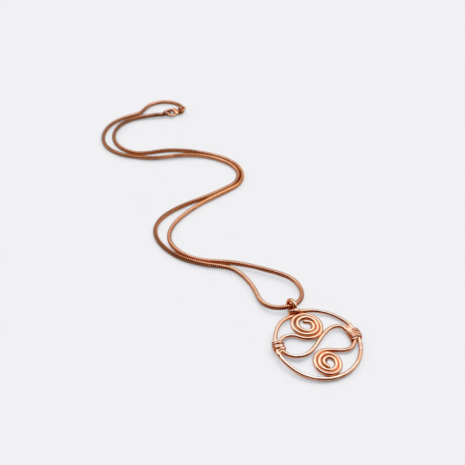 La cadena de cobre, de diseño simple y atemporal, permite que el brillo natural del metal se exprese con sutileza. Es el complemento ideal para acompañar el dije y aportar equilibrio a la pieza completa.