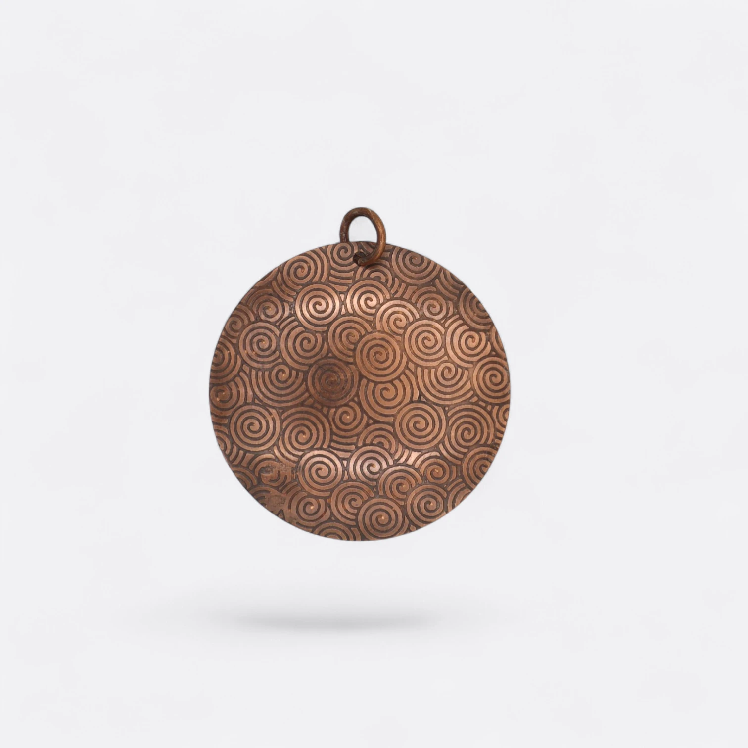 El Dije Vayu es una pieza elaborada en cobre puro con acabados que resaltan su carácter ancestral y atemporal. Su diseño circular, recorrido por múltiples espirales grabadas, simboliza el movimiento invisible pero constante del aire, la respiración y la energía que fluye y transforma.