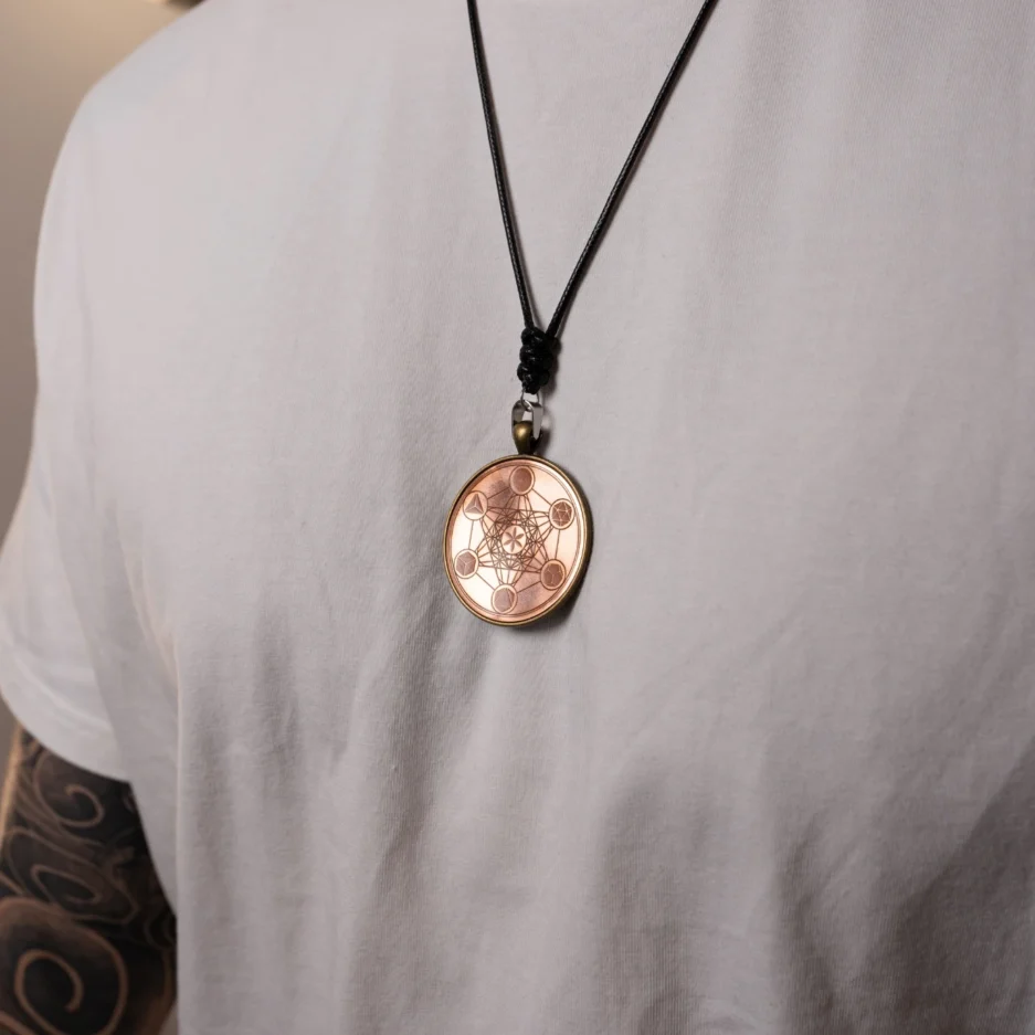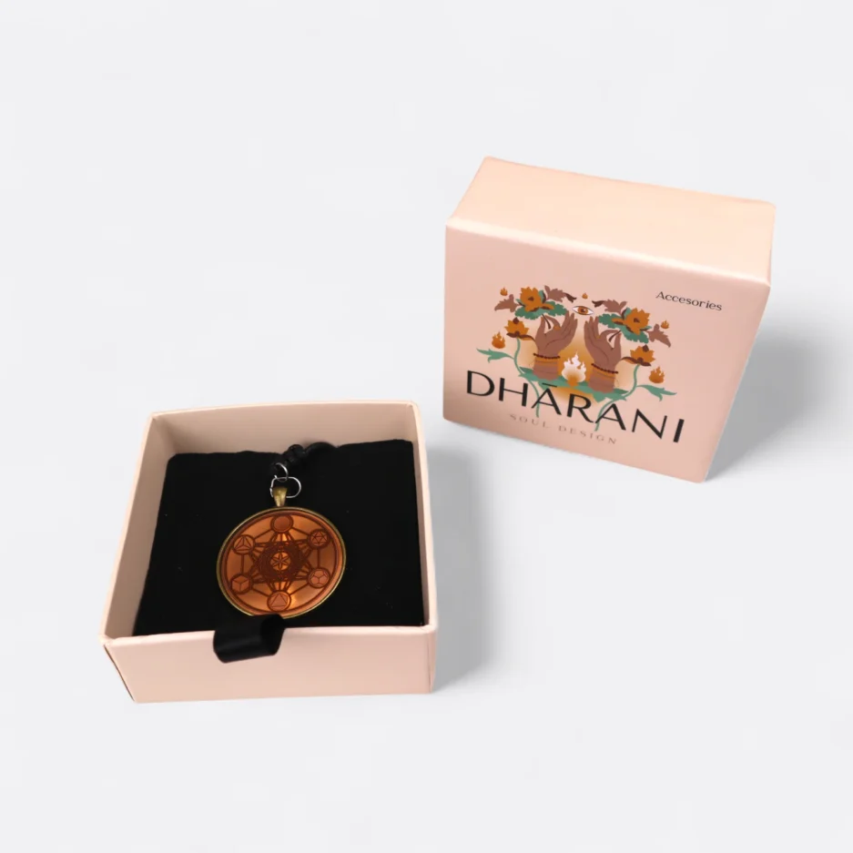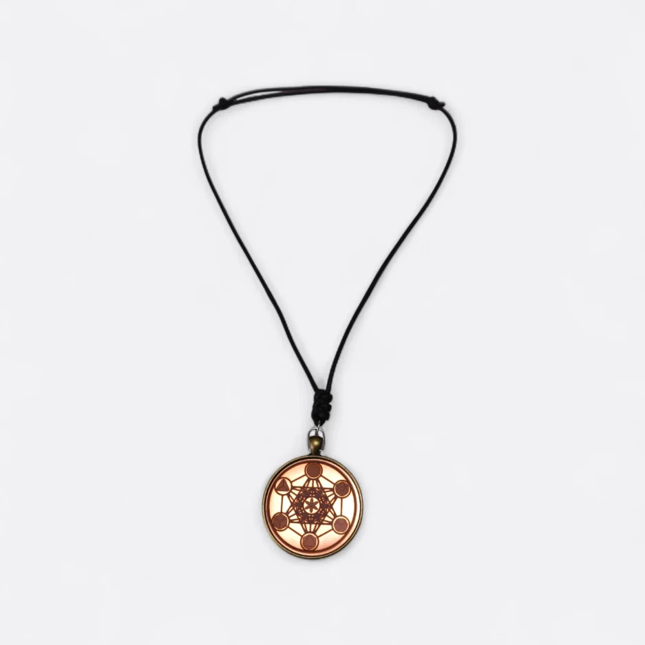 Conecta con la energía ancestral a través de este dije elaborado con disco central en cobre puro grabado con geometría sagrada y montado sobre un cabujón de bronce envejecido, que le da un estilo rústico y místico.