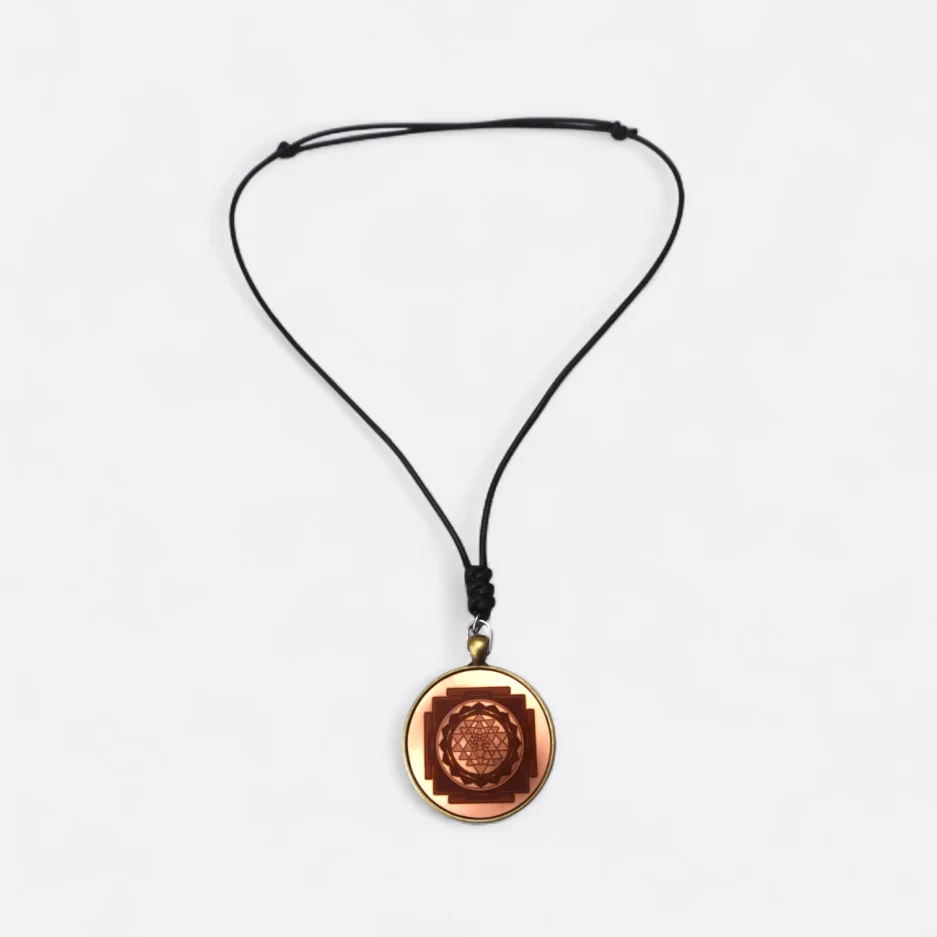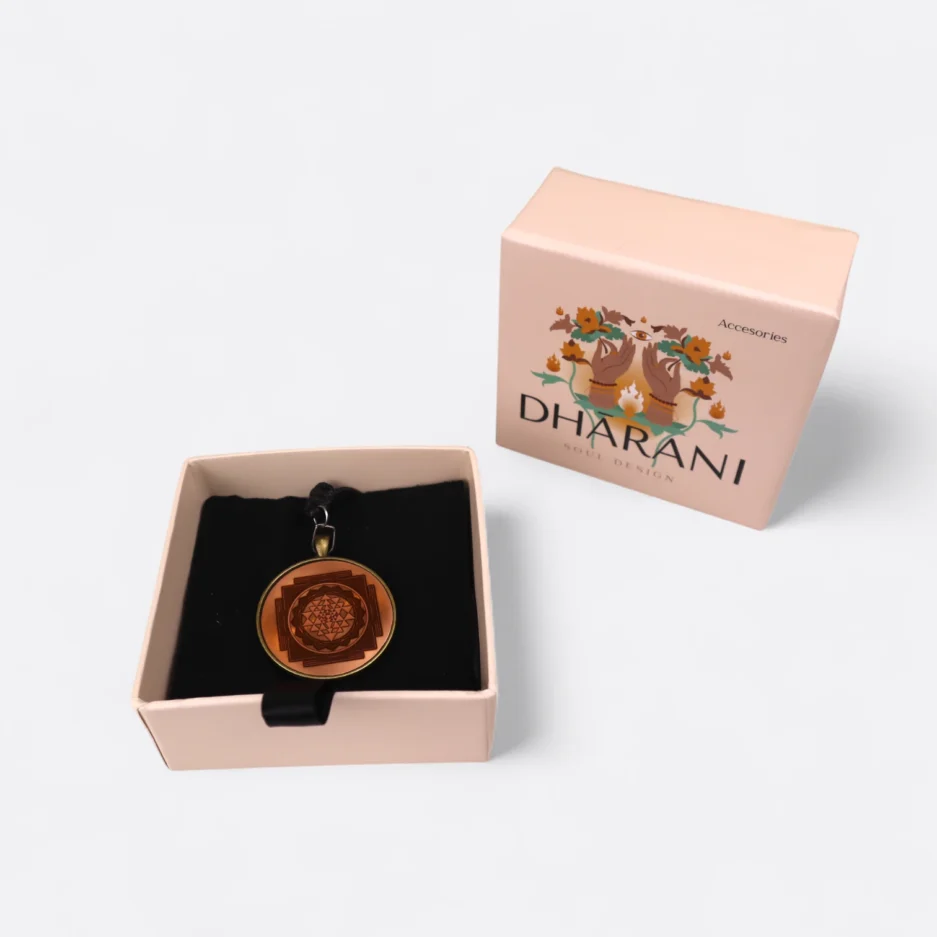 Conecta con la energía ancestral a través de este dije elaborado con disco central en cobre puro grabado con geometría sagrada y montado sobre un cabujón de bronce envejecido, que le da un estilo rústico y místico.
