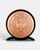 Alrededor del santo se encuentran grabadas las tradicionales inscripciones en latín, que forman parte del conocido “Exorcismo de San Benito”, utilizado históricamente como protección contra energías negativas, envidias y malas influencias. Estas letras y símbolos han sido meticulosamente grabados en el cobre para conservar su fuerza espiritual y significado originalCobre: un metal cargado de intención