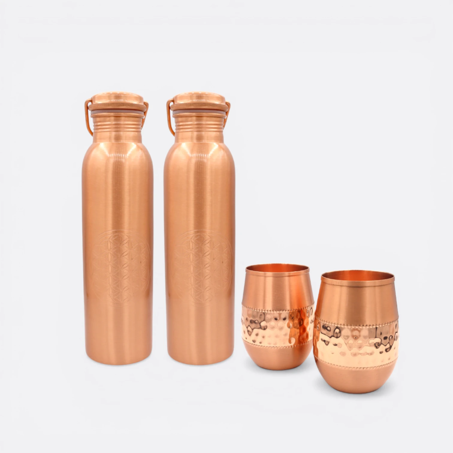 Incluye 2 botellas de cobre con capacidad de 1 litro y 2 vasos de cobre, piezas elaboradas para mantener una rutina simple, equilibrada y conectada con el bienestar.