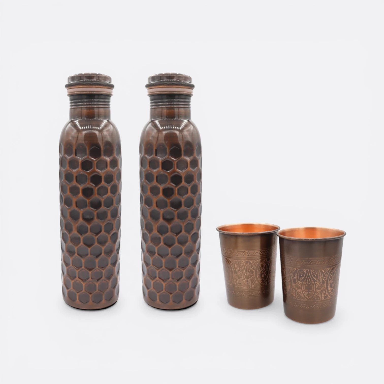Inspirados en tradiciones ancestrales, el cobre ha sido valorado por sus propiedades asociadas a la armonización y purificación del agua, convirtiendo este set en un complemento ideal para tu día a día.