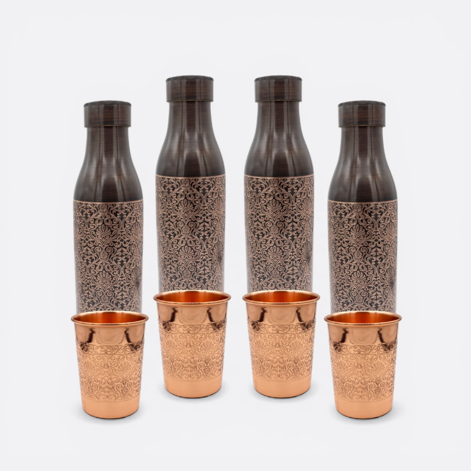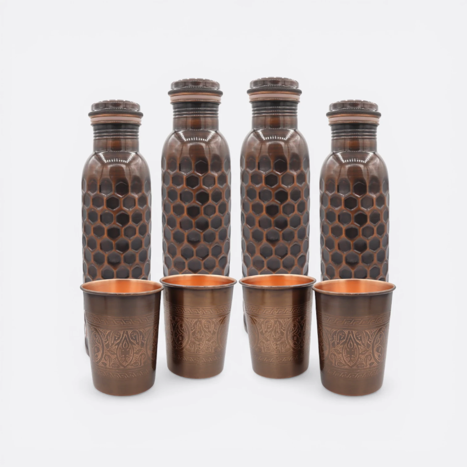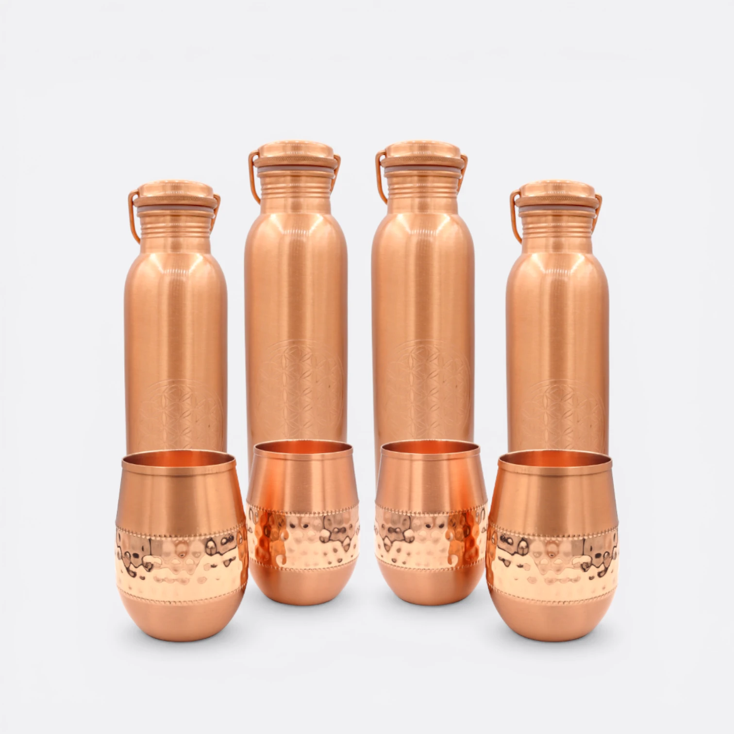 Incluye 4 botellas de cobre con capacidad de 1 litro y 4 vasos de cobre, piezas elaboradas para mantener una rutina simple, equilibrada y conectada con el bienestar.