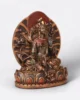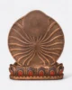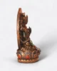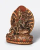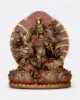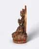 Esta figura muestra a Tara Verde sentada en una flor de loto, con una expresión serena pero llena de fuerza. En una de sus manos sostiene una flor de utpala (loto azul), símbolo de pureza, y sus gestos sagrados (mudras) invocan generosidad, protección y enseñanza. La figura combina tonos verdes, dorados y cobrizos, con detalles ornamentales en su corona y vestimenta, que reflejan su realeza espiritual y su energía divina.